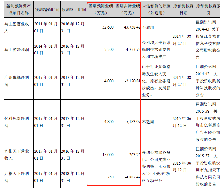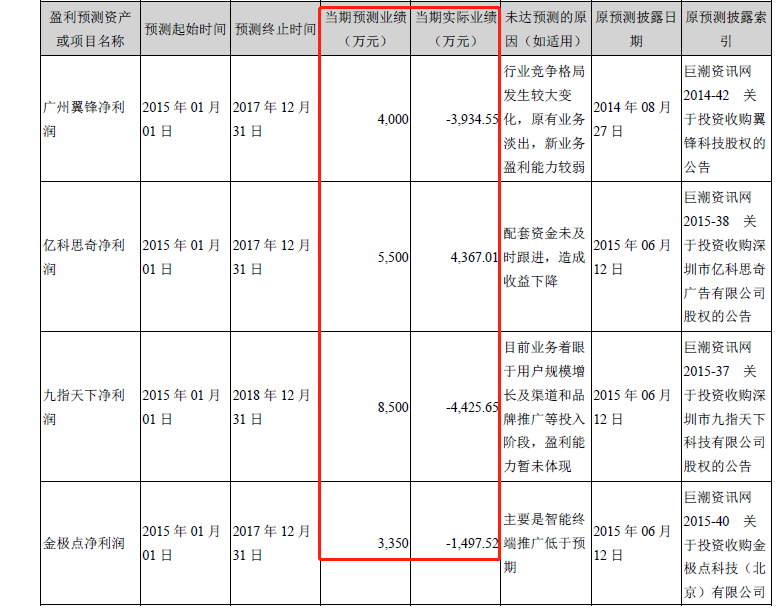 2017年,5家具有业绩承诺的公司无一达标,其中广州翼峰科再次计提8191.91万元、金极点计提1044.42万元、剑梦科技计提447.07万元,共计提9683.40万元商誉损失。