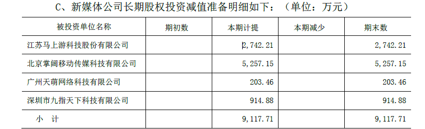 此外,电广传媒2017年还开始计提长期股权投资损失,对江苏马上游、北京掌阔、广州天萌、深圳九指这四项长期股权投资计提了9117.71万元减值准备。