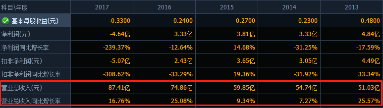 与芒果系资产擦肩而过,并不是“中国传媒第一股”电广传媒泯然众人的关键原因。财联社翻阅财报发现,自2015年开始,电广传媒便进入“增收不增利”的阶段。2015年-2017年期间,公司营收分别为59.85亿、74.86亿、87.41亿;净利润分别为3.81亿、3.33亿、-4.64亿;扣非净利润则从3.65亿下滑到2.42亿,再骤降至亏损5.07亿。