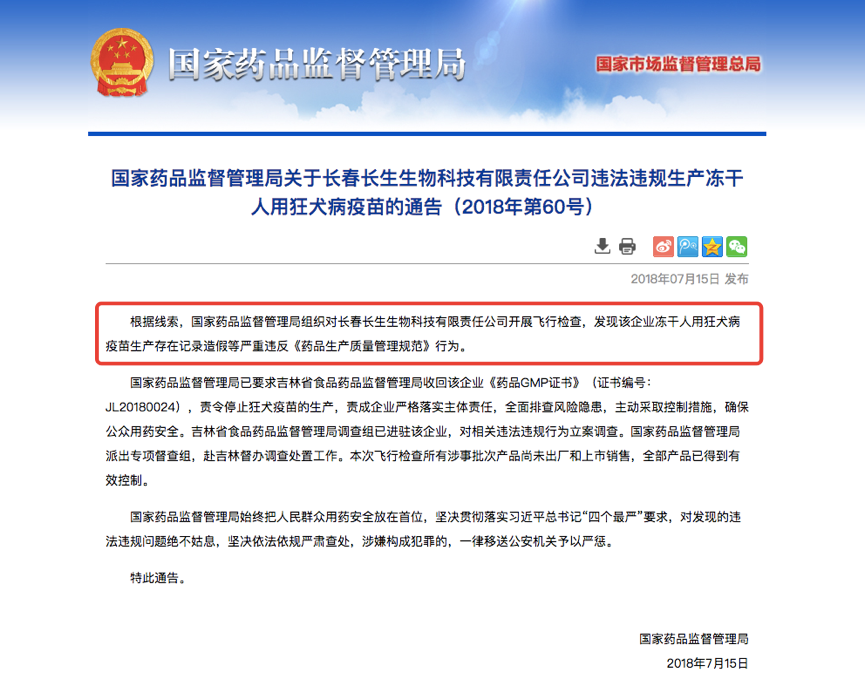 财联社7月16日讯,狂犬病是一种狂犬病毒所致的急性传染病,人患狂犬病后的病死率几近100%,只有及时注射狂犬疫苗才能避免发病,但前提是疫苗必须合格。然而,7月15日,国家药品监督管理局发布通告称,长春长生生物科技有限责任公司(以下简称长春长生)因冻干人用狂犬病疫苗生产存在记录造假等违法违规行为,已被立案调查并没收药品GMP证书,停止生产狂犬疫苗。