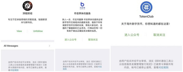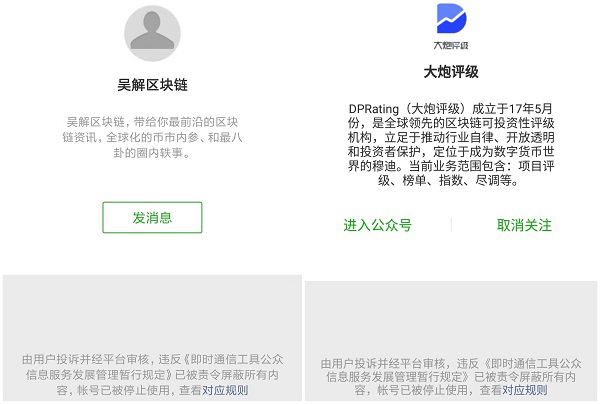 今年三月,微信公号“火币网”突然改名为“huobicom”,OKEX及多家币圈媒体的公众号被封,被封原因为“由用户投诉并经平台审核,涉嫌违反相关法律法规和政策”。