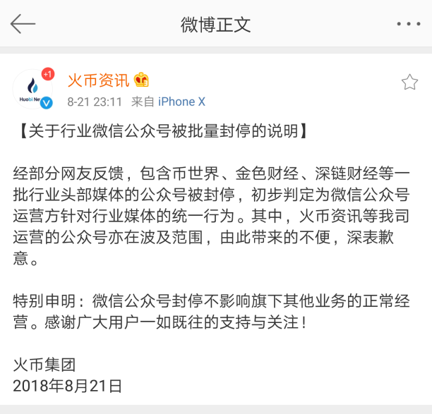 火币资讯也在微博上回应了关于微信公众号被封停,称不影响火币旗下其他业务的正常运营。
