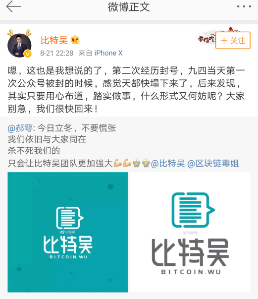 吴解区块链负责人表示,应对此次封号,将另做一个新号,对老号进行申诉,但申诉成功的可能性不大。负责人称:“幸亏有一半精力放在微博,并没有全军覆没。”