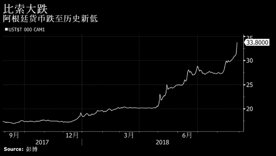 阿根廷美元债也下跌,10年期债券每1美元面值跌1.6美分,至74.5美分,收益率上升33个基点,至近乎创纪录的10.15%。