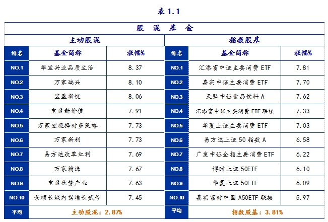指数股基平均上涨3.81%,消费相关指数基金涨幅靠前,其中,涨幅最高的是汇添富中证主要消费ETF,上涨7.81%,嘉实中证主要消费ETF、天弘中证食品饮料A、汇添富中证主要消费ETF联接和华夏上证主要消费ETF分别涨7.70%、7.62%、7.33%和7.03%,上涨均超过7%。除了消费指数基金外,上证50相关基金涨幅亦排名指数基金前十,易方达上证50指数A上涨6.22%。总体来看,涨幅在3%以上的产品占比为69%,没有产品取得负收益。