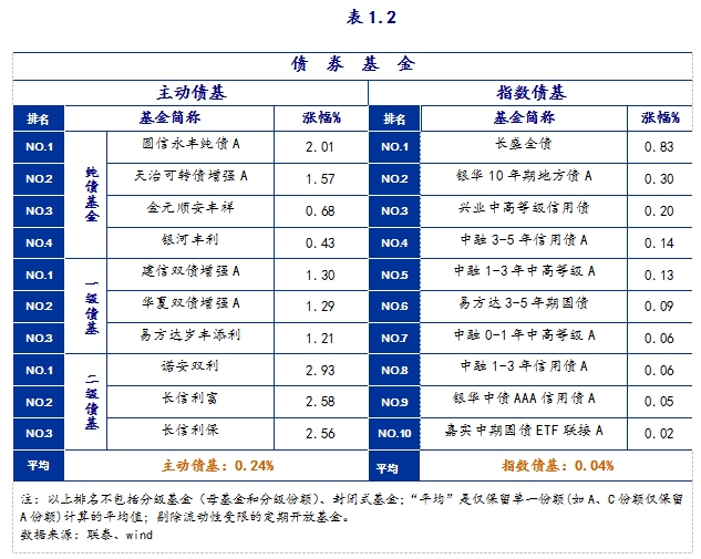 纯债基金中,圆信永丰纯债A和天治可转债增强A涨幅靠前,涨幅超过1%。一级债基中,建信双债增强A、华夏双债增强A、易方达岁丰添利等涨幅靠前。二级债基中,诺安双利、长信利富、长信利保涨幅靠前。