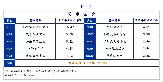 截至上周五,货币基金七日年化收益率平均为2.82%,中位数为2.90%,39%的产品7日年化收益在3%以上,52%的产品7日年化收益在2%到3%之间,其中最高的是上投摩根现金管理的15.42%,其次是交银现金宝A的5.40%,兴全天添益A的5.32%。