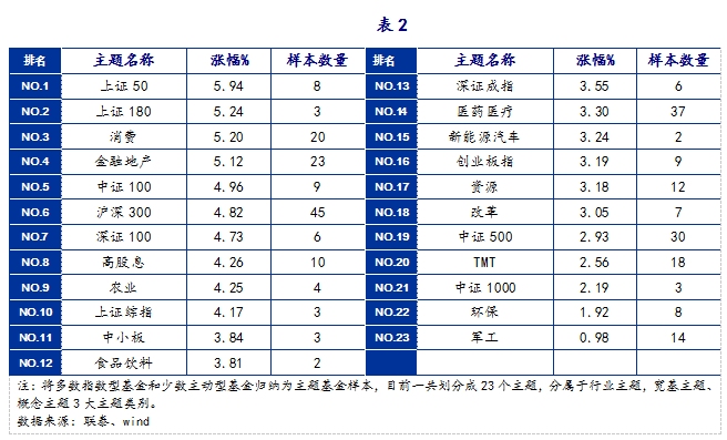 2. 主题基金涨幅: 23个主题全部上涨,消费、上证50涨幅靠前