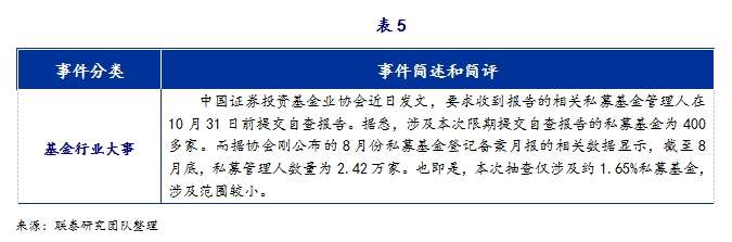 5. 重大事件: 中国证券投资基金业协会要求收到报告的相关私募基金管理人在10月31日前提交自查报告