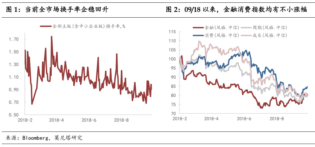 但目前该情况已经发生转变,9月18日换手率猛然抬升,其后在0.91%的中枢下震荡(9月前半月换手率中枢仅为0.79%),同时消费、金融风格指数分别上涨5.01%、4.51%。