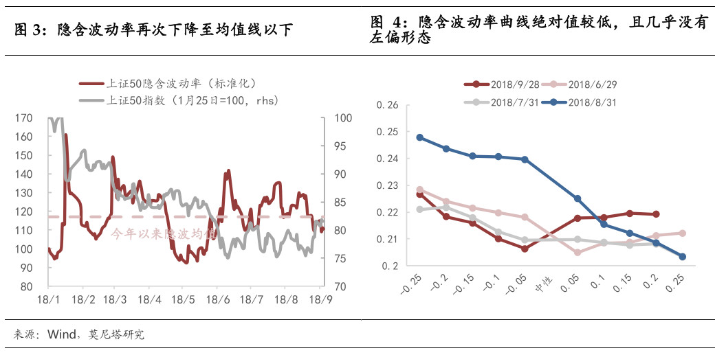 今年2月以来,隐含波动率又与贸易战的进展联系紧密;6月以来,上证50ETF隐含波动率与指数的走势呈现明显的镜像关系,这说明贸易摩擦决定的情绪或风险偏好是影响市场走势的主因。而9月18日以后,隐含波动率再次下降至均值线以下。