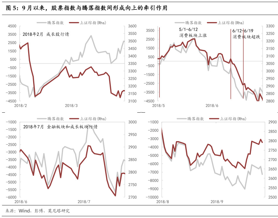 而9月4日至9月17日,股票指数与腾落指数共同下行,且后者的下行的斜率更高,对应着医药生物板块的领跌,但金融板块尚稳;18日之后,二者反弹,股票指数上行的斜率也更高,这反映着资金在大盘股中的定力并未发生减弱。