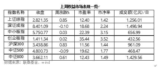 全周来看,上证综指上涨0.85%,沪深300涨0.83%,深证成指跌0.10%,中小板指涨0.03%,创业板指涨0.02%。截至上周五,代表大盘股的沪深300市盈率为11.56,市净率为1.44;代表成长风格的中证500市盈率为19.62,市净率为1.77。
