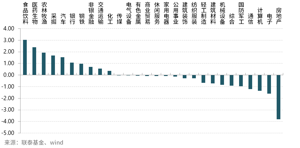 2、行业表现:食品、医药表现亮眼,房地产大幅下跌