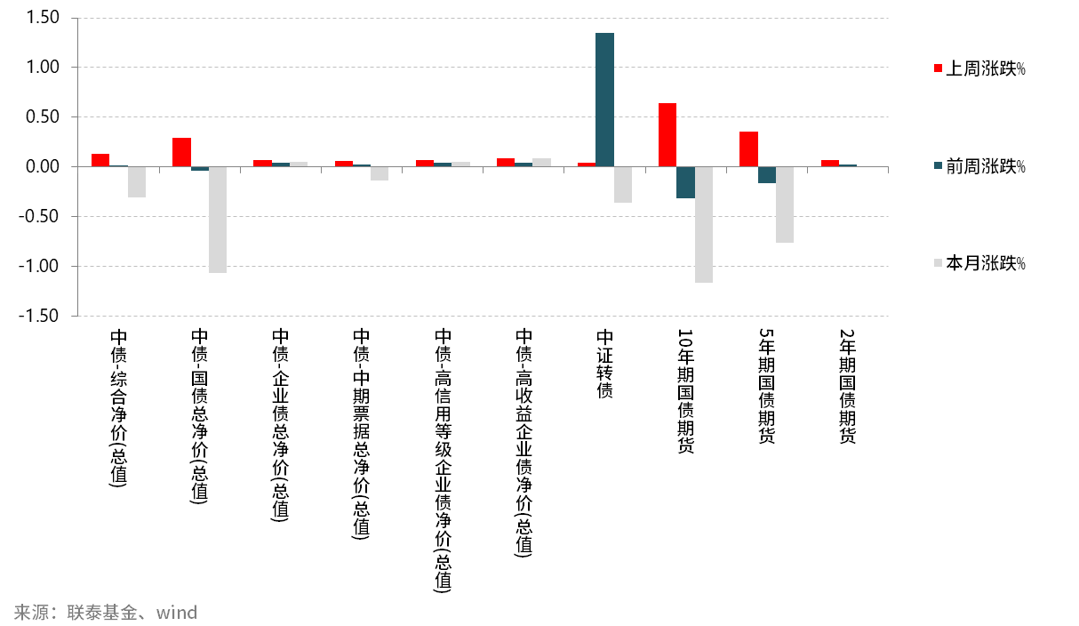 上周各期限国债期货主力合约大幅上涨,2年期国债期货上涨0.07%,5年期国债期货上涨0.36%,10年期国债期货上涨0.64%。