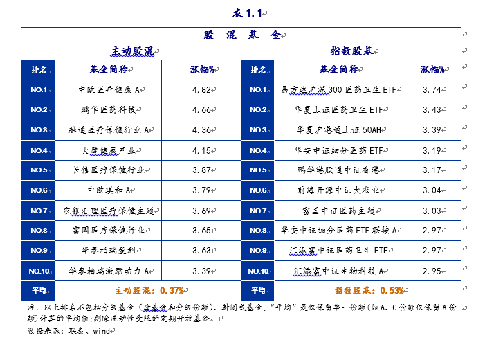 上周,主动股混基金平均涨幅为0.37%,医药、健康等相关基金涨幅靠前,中欧医疗健康A涨幅最高,周涨4.82%,其次是鹏华医药科技的4.66%,融通医疗保健行业A的4.36%。大摩健康产业、长信医疗保健行业、中欧琪和A等产品也排名在主动股混基金前十。总体来看,上涨产品占66%,下跌的产品占比25%,有9%的产品收益持平。
