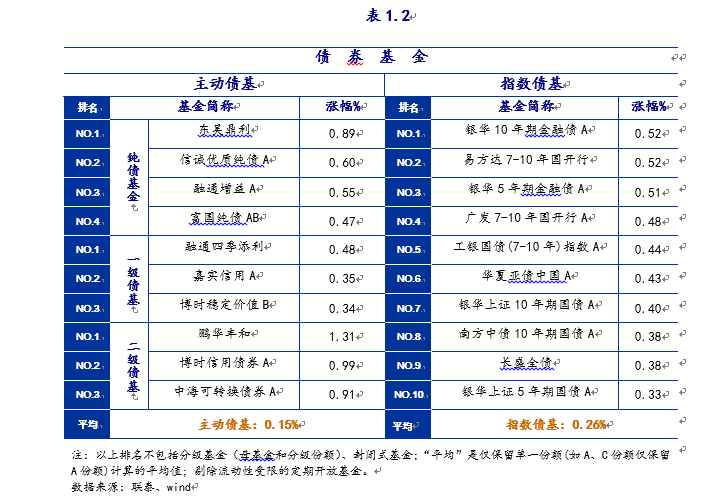 纯债基金中,东吴鼎利、信诚优质纯债A、融通增益A、富国纯债AB等涨幅靠前。一级债基中,融通四季添利、嘉实信用A、博时稳定价值B等涨幅靠前。二级债基中,鹏华丰和、博时信用债券A、中海可转换债券A涨幅靠前。