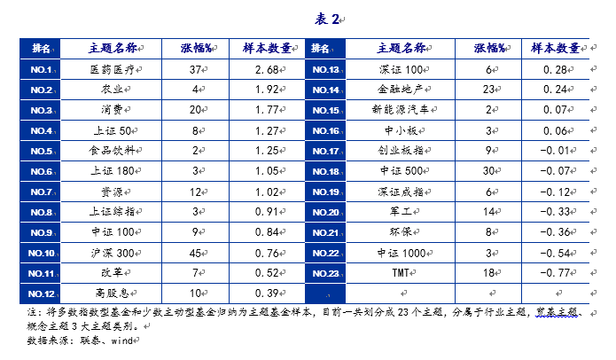 2. 主题基金涨幅:23个主题中,医药医疗、农业等主题涨幅靠前,TMT、军工等主题下跌