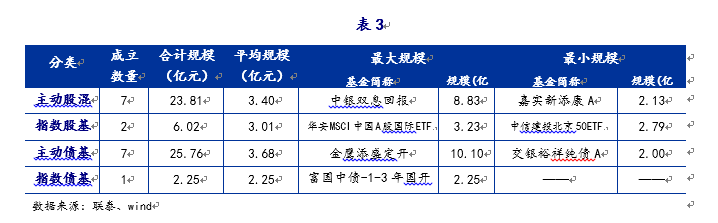 上周新成立基金17只,主动股混基金共7只,平均规模为3.40亿元,其中中银双息回报规模为8.83亿元,规模最大。指数股基共2只,平均规模为3.01,华安MSCI中国A股国际ETF规模最大,募集为3.23亿元。主动债基7只,平均规模为3.68亿元,其中规模最大的是金鹰添盛定开,规模为10.10亿元,其次是浦银安盛盛泽定开,规模为5.10亿元。 指数债基1只,富国中债-1-3年国开债A,规模为2.25亿元。