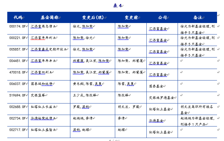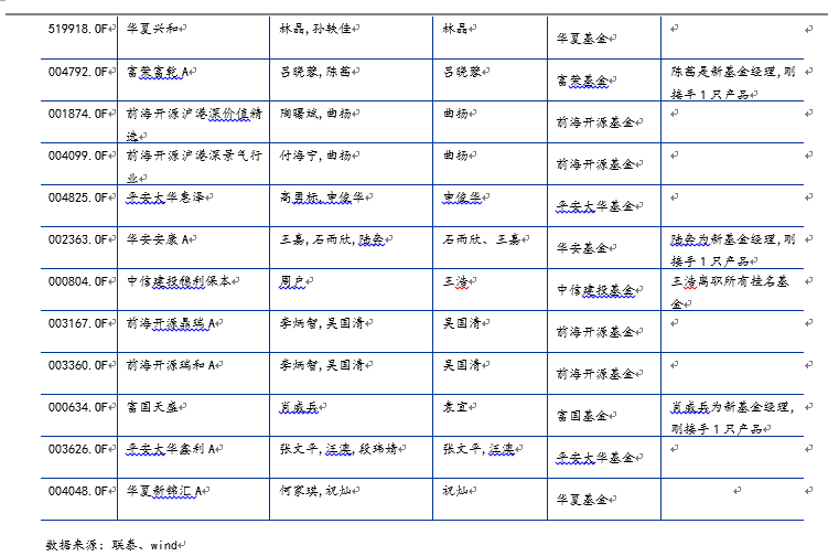 新人方面,肖威兵(富国基金)、陆奔(华安基金)、陈茜(富荣基金)、赵端端(泓德基金)、徐光(汇添富基金)等新基金经理开始接管基金产品。