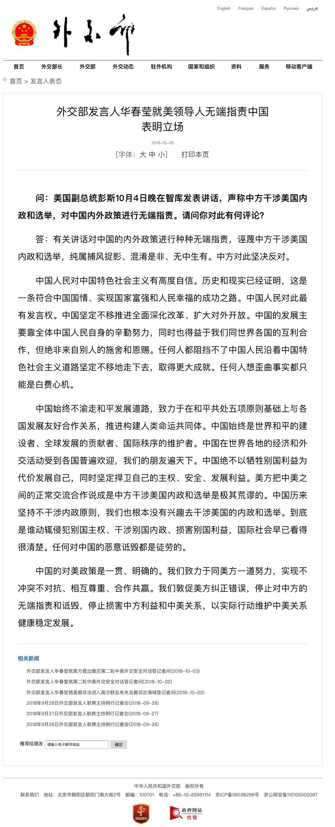 【外交部发言人华春莹就美领导人无端指责中国表明立场】财联社2018年10月5日讯,美国副总统彭斯10月4日晚在智库发表讲话,声称中方干涉美国内政和选举。外交部发言人华春莹表示,有关讲话对中国的内外政策进行种种无端指责,诬蔑中方干涉美国内政和选举,纯属捕风捉影、混淆是非、无中生有。中方对此坚决反对。