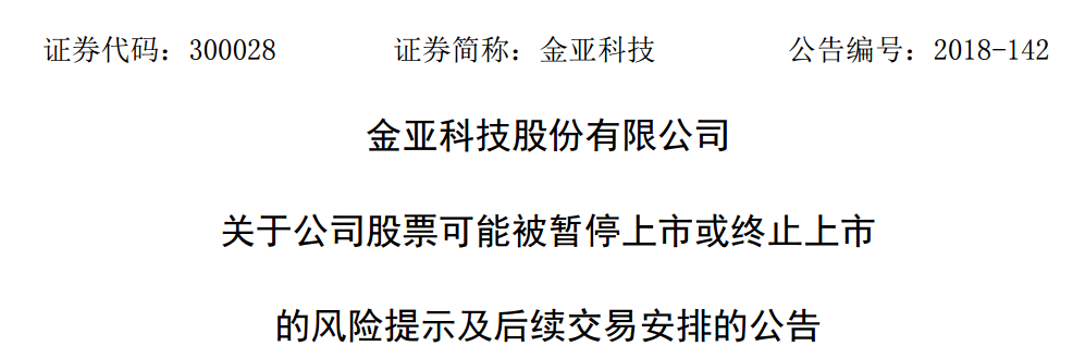 金亚科技也发公告,提示投资者公司股票可能被暂停上市或终止上市。