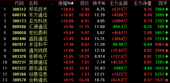 5G概念股在尾盘的逆势表现,使得其成为今天唯一一个能看的群体。邦讯技术、东方通信、亚光科技、汇源通信、世纪鼎利逆势涨停,盛路通信、东信和平、通光线缆均暴涨7%以上,依顿电子大涨5%,奥维通信、超讯通信、创意信息、会畅通讯上涨4%,新易盛、春兴精工、纵横通信、共进股份、杰赛科技等个股亦有不同程度的上涨表现。
