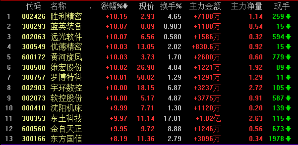 今天与昨天类似,最吸引目光的不是领涨的白酒板块,而是涨停股众多的工业4.0相关板块。远光软件、蓝英装备、黄河旋风、沈阳机床、东土科技、宇环数控等逾10只工业4.0概念股涨停,东方国信、上机数控、拓斯达均暴涨7%以上,鼎捷软件、秦川机床大涨6%,贝斯特、联得装备、哈工智能、海得控制、能科股份、智云股份、智慧松德等个股亦有不同程度的大涨。