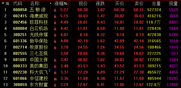 今天和昨天一样,没有热点板块,只能说沪深300指标股这个群体表现不错。五粮液、海康威视携手领涨,欧菲科技、白云机场、光线传媒、新华保险均大涨4%以上,牧原股份、三七互娱、中国太保、美的集团、科大讯飞、中信建投、东方财富、雅戈尔、同花顺、中国人寿等个股亦有不同程度的上涨。