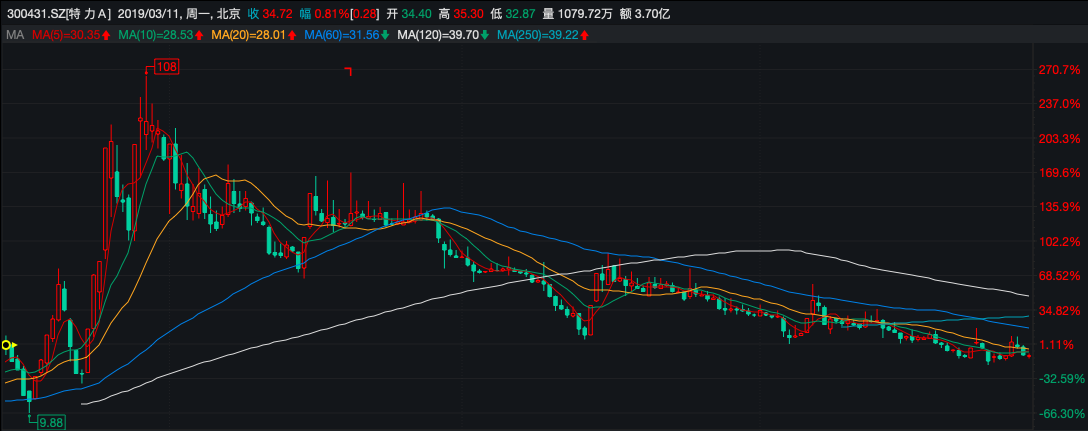 不过,出来混总是要还的,妖冠A股的特力A终于在2016年熄火,遭遇了市场无情的抛弃,股价持续下跌。截至3月11日特力A收报34.72元,以108元的最高点计算,股价跌幅为67.85%。