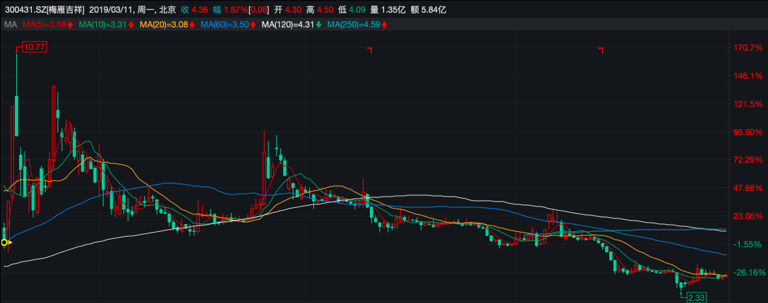 但是,梅雁吉祥的业绩仍在不断走低,证金公司获利出局后,留下一地鸡毛。截至3月11日梅雁吉祥收报4.36元,与4年前最高10.77元的股价相比,跌幅接近60%。