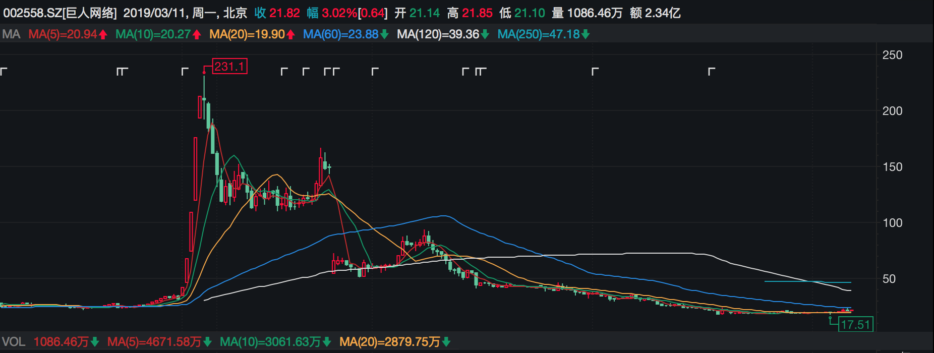 2017年4月,世纪游轮正式更名为巨人网络。在2018年,巨人网络因305亿收购Playtika项目将进入中国证监会并购重组委审核阶段,再次停牌,但在复牌后却没有像上一次那样继续妖下去。截至3月11日,巨人网络股价收于21.82元,按前复权的股价计算,股价从17年高点下跌71.76%。