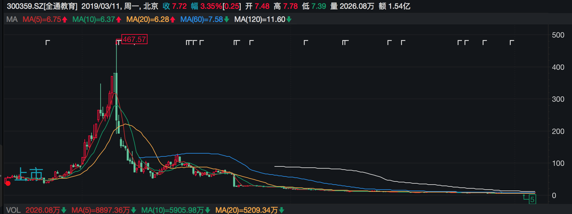 凭着站在互联网教育的风口上,全通教育2015年在资本市场上的表现也是十分惊人。2015年3月34日报收于320.65元,超越曾经的中国船舶成为A股历史上最贵的股票。之后最高位达到467.57元,较其上市开盘价24.16元上涨超过1835.31%。