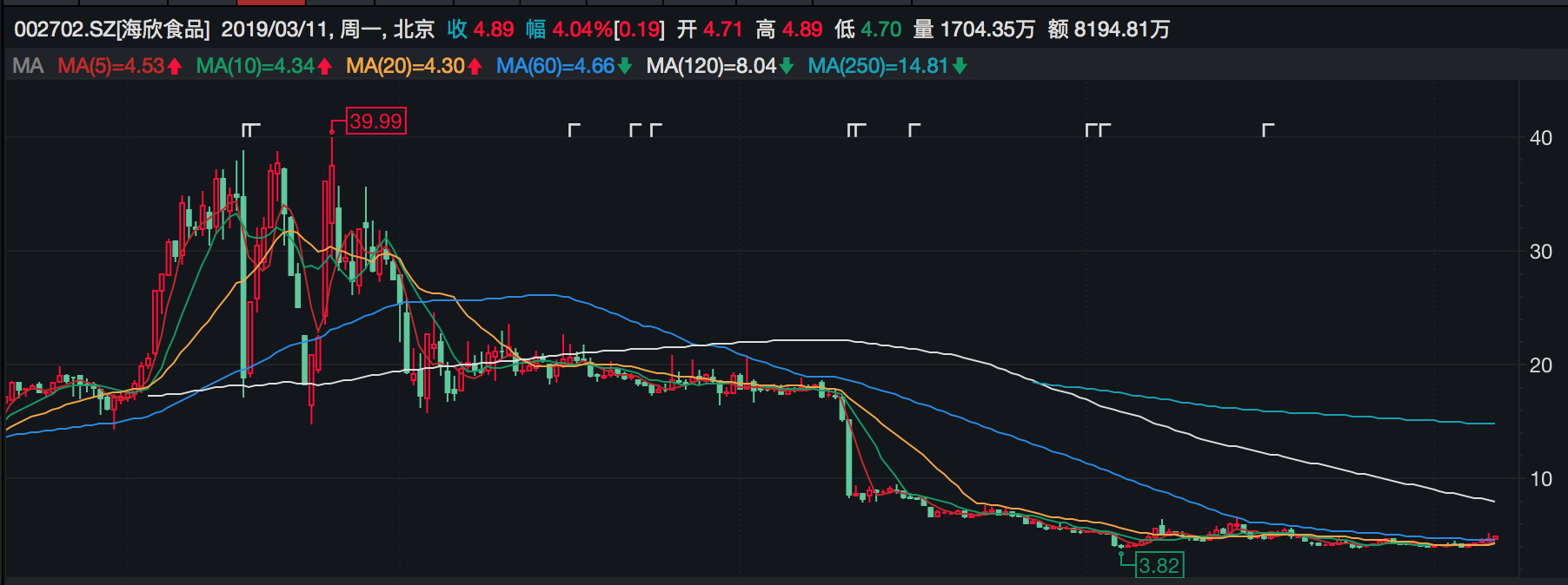 游资热炒还是海欣食品上涨的主要原因,据其当年三季报显示,机构持股占比仅为0.89%。但好景不长,海欣食品在一顿爆炒之后,就开始了一路下跌,2017年的大跌后更是雪上加霜。截至3月11日,海欣食品股价收于4.89元,按前复权的股价计算,股价从15年高点下跌79.2%。
