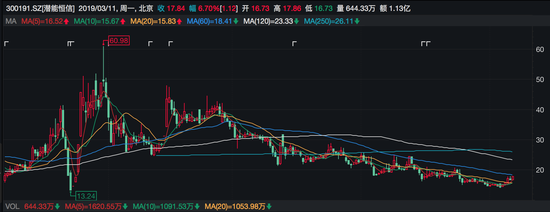 截至3月11日,潜能恒信股价收于17.84元,按前复权的股价计算,股价从15年高点下跌70.71%。