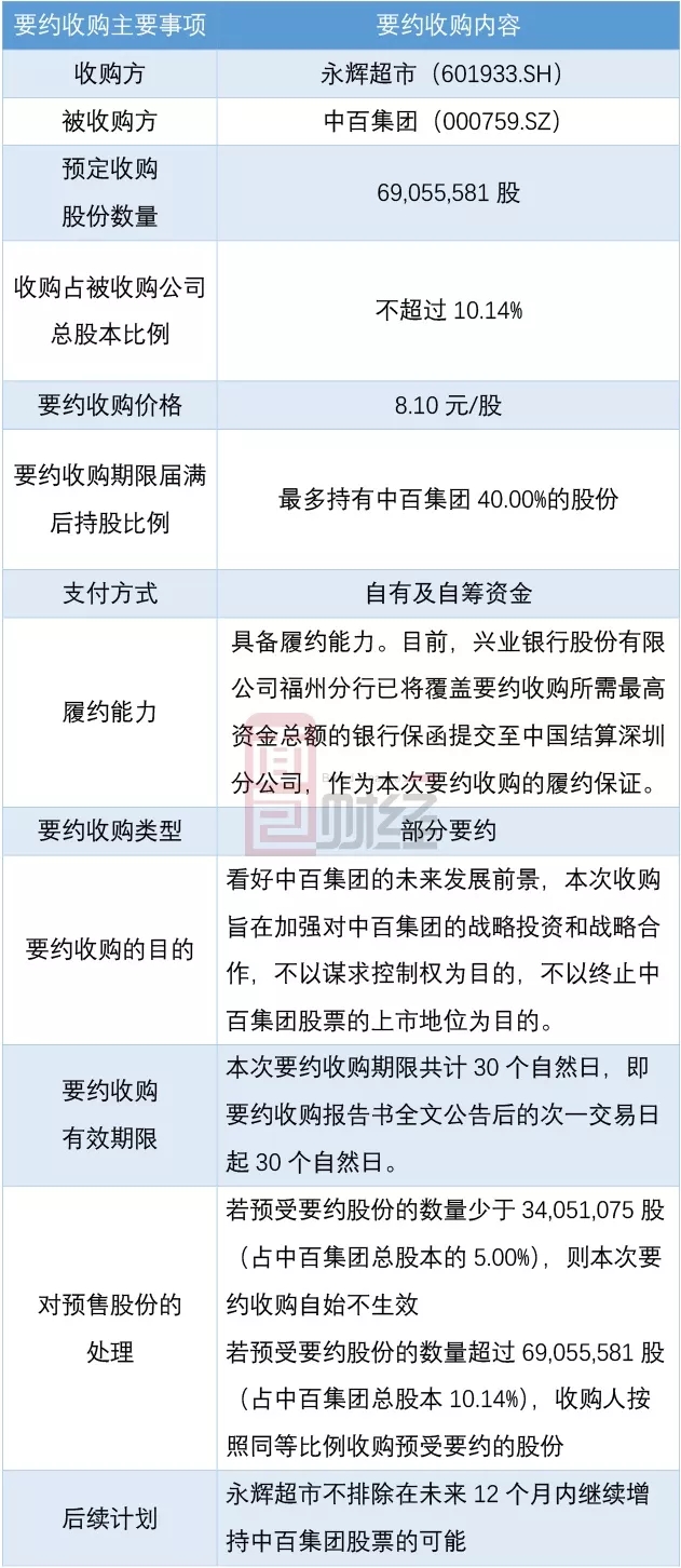 中百集团(000759.SZ)4月11日收盘后发布的《要约收购报告书摘要》显示,永辉超市拟要约收购中百集团不超过10.14%的股份。如果要约收购完成,永辉超市持股比例将可能会从目前的29.86%提高到不超过40%。