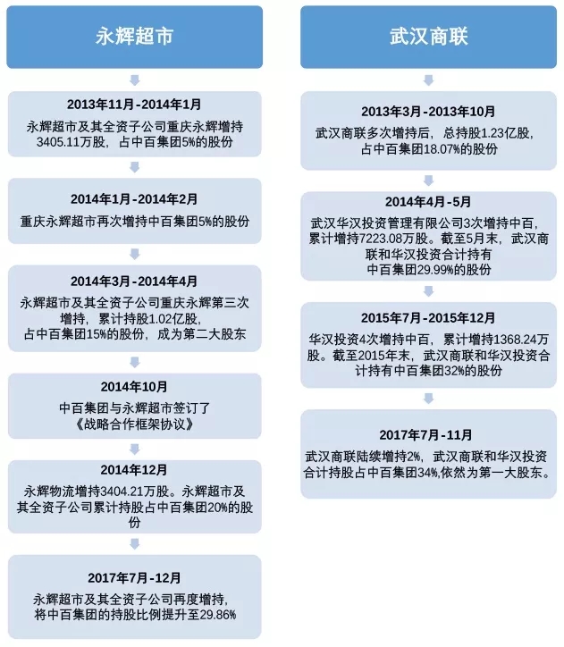 2014年1月初次举牌,随后便开始快速增持该公司股份,截止2014年末,永辉超市及其全资子公司已持有中百集团20%的股份。如此快速的增持也引起了第一大股东武汉商联的注意,对于永辉超市频繁增持,武汉商联和华汉投资也启动了增持步伐。截止2014年末,武汉商联和华汉投资合计持有中百集团29.99%的股份。