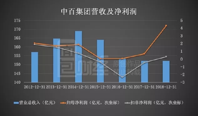 数据显示,截至2018年末,中百集团的总营收较2014年相比下滑较为明显,但归母净利润却较以往相比出现大幅提升,扣非净利润在连续亏损三年之后,扭亏为盈。