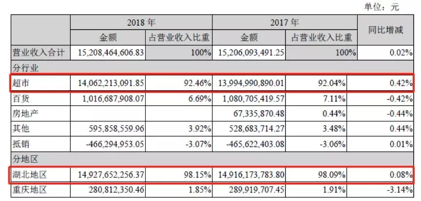 从收入构成来看,超市仍是中百集团的主要收入来源。截止2018年底,超市实现营业收入140.62亿元,占中百集团总营收的92.46%。
