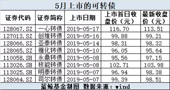 据Wind数据显示,5月共有8只可转债上市,但除了一心转债、核能转债外,其余6只均在上市首日跌破发行价100元,上市首日破发率高达75%。截至5月30日收盘,这6只可转债的价格仍然低于发行价,其中最低的雅化转债收盘价为95.64元。