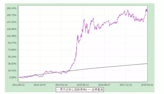 而易方达安心回报的业绩也确实值得这60多亿资金的信任。据wind数据统计,该基金近3年、近1年的业绩分别为19.78%、4.94%,自2011年6月成立以来已经累计获得了177%的收益,且它在2019年5月份的市场回调中仅回撤了1.66%,低于同类平均水平。