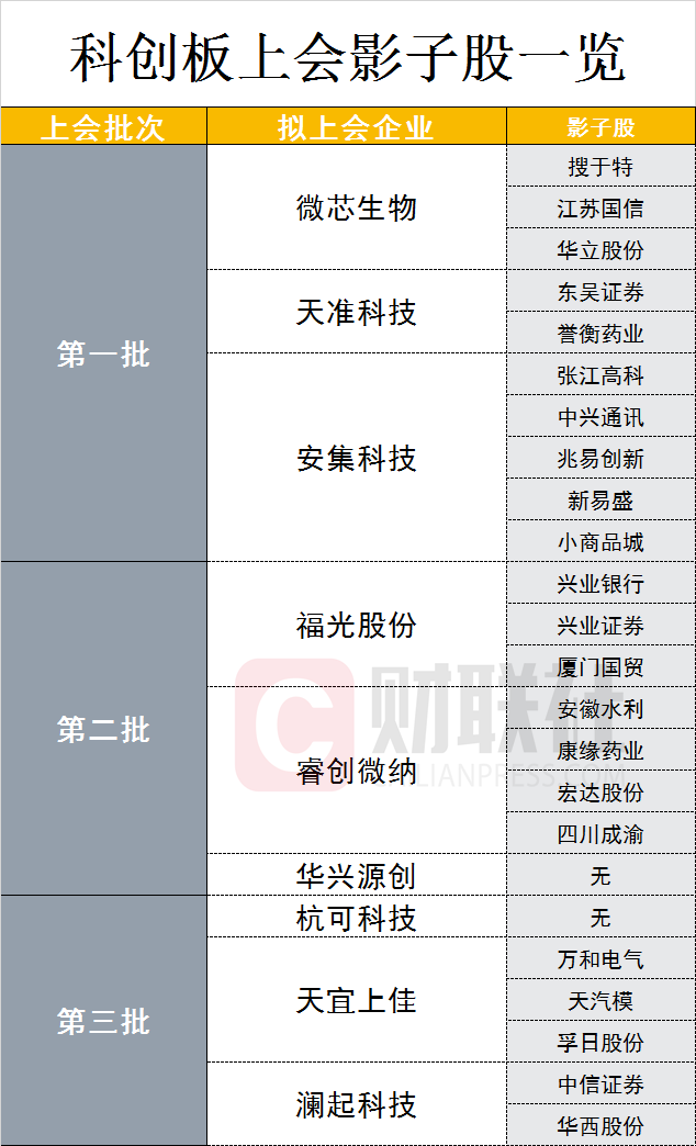 据财联社统计,本次科创板过会的3家企业背后共有10家影子股,微芯生物背后有搜于特、江苏国信、华立股份3家影子股,天准科技背后有东吴证券、誉衡药业2家影子股,安集科技背后有张江高科、中兴通讯、兆易创新、新易盛、小商品城5家影子股。