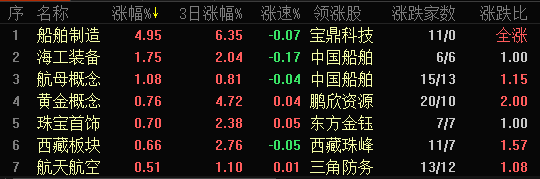 从盘面上看,船舶制造、黄金、西藏等概念板块涨幅居前,油气改革、电子烟、稀土永磁等概念板块跌幅居前。船舶制造概念股走势强劲,天海防务、宝鼎科技涨停,中国船舶涨逾9%。