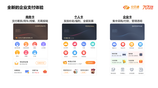 2018年开始,分贝通逐步完善支付的能力,商务卡/企业卡企业直接付,个人卡分贝券付,积分分贝币付,个人微信/支付宝付,组合的支付方式满足用户的个性化需求。