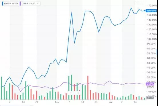 BeyondMeat于2019年5月2日在纳斯达克挂牌上市,IPO当日,该公司开盘价46美元,较发行价25美元溢价84%;股价收涨163%,至65.75美元,创金融危机以来最佳IPO首日表现。截止到7月19日收盘,BeyondMeat (BYND)股价已达170.34美元,后劲十足。