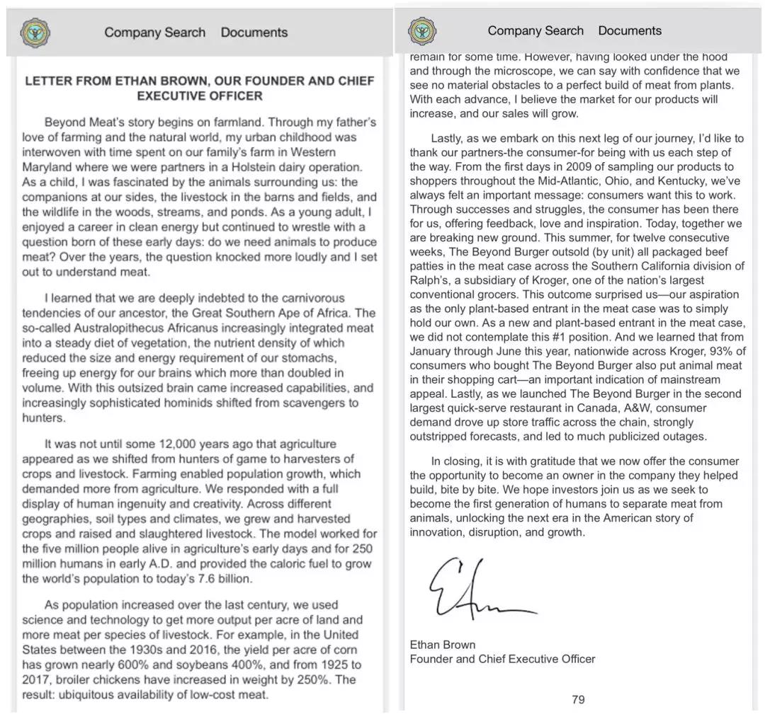 在递交给美国证券交易委员会(SEC)的招股书中,有着与众不同的地方,一封来自创始人Ethan Brown信,信中他讲述了自己从小在自家农场的经历。