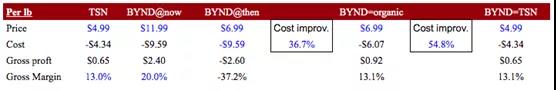其次,大体量玩家的优势还在于资本成本更低。这意味着,即使生产成本类似,BYND也需要为高于TSN的产品定价而支付其资本成本。
