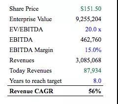 从当前价格来看,依旧假设EV/EBITDA为20倍,8年达到目标收入水平,EBITDA利润率为15%。在这种情况下,未来8年的收入需要每年增长56%,以证明现在的市场价格是合理的。