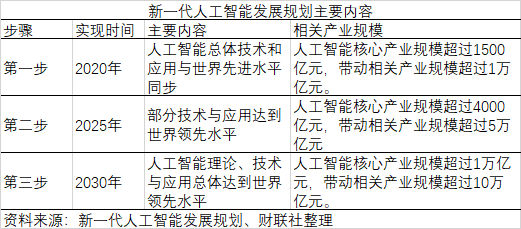 2017年7月国务院印发的《新一代人工智能发展规划》提出了我国人工智能产业层面发展的时间表及具体目标,报告提出,到2030年,人工智能核心产业规模将超过1万亿元,带动相关产业规模10万亿元。