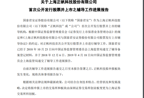 上海正帆科技股份有限公司(以下简称“正帆科技”)就在上市辅导期间,临时更换了上市方向。根据其上市辅导机构国泰君安,于8月14日在上海证监局披露的上市辅导工作进展报告,正帆科技决定将拟申报上市的交易所和板块由深圳证券交易所创业板变更为上海证券交易所科创板。